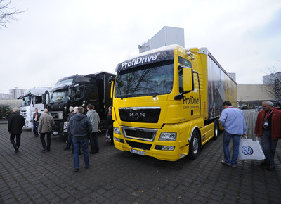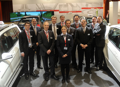 von 30: Fahrschul-Spezialist Peter Bogdann (4.v.r.) hatte bei Mercedes-Benz Unterstützung von Fahrschul-Entwickler Werner Hammer (1.v.r.) und dem Sonderfahrzeug-Entwickler Ralf Schamaitis (3.v.l.)