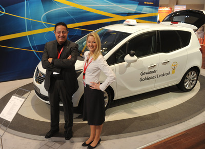 von 30: Bertram Kunze, der bei Opel nun der "Tausendsassa" für viele Fragen rund um Fahrschul- und andere Sonderfahrzeuge ist, zeigte zusammen mit einer Hostess den Fahrschul-Meriva