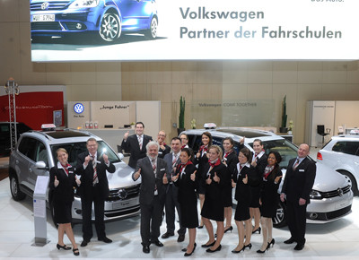 von 30: Bei Volkswagen genoss Fahrschul-Mann Bernd Schlunke (3.v.l.) breite Unterstützung, unter anderem von Thomas Bergmann von Volkswagen Leasing (2.v.l.) und von Matthias Lorenz (rechts außen)