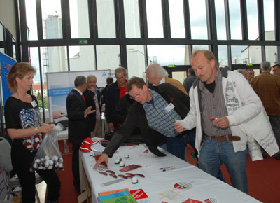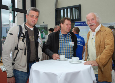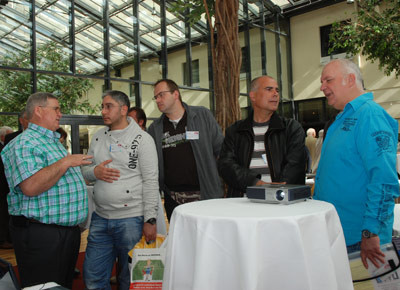 von 15: An den Kaffeetischen tauschten sich die Besucher aus. Etwas hinderlich dabei: die großen Werbe-Schirme des Dekra, die der links abgebildete Kollege auf dem Rücken trug