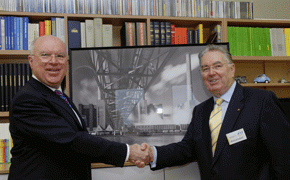 von 18: Heinz Dowerg von Volkswagen (l.) übergab Gerhard von Bressensdorf einen hochwertigen Fotodruck eines bekannten niedersächsischen Fotokünstlers, der ihn an Wolfsburg erinnern soll
