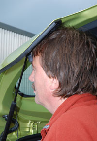 von 14: Unter der weit öffnenden Heckklappe können auch große Menschen aufrecht stehen. Wenn sie sich zur Seite wenden, stoßen sie aber leicht mit dem Kopf an die seitlich herumgezogene Heckklappe