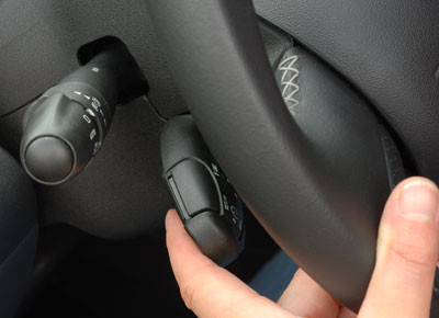 von 14: Der Satellit für den Geschwindigkeitsregler wird vom Lenkrad völlig verdeckt, der Fahrlehrer kann ihn nur im Stand erklären. Lenkradtasten wären bedeutend besser