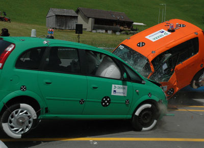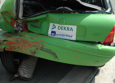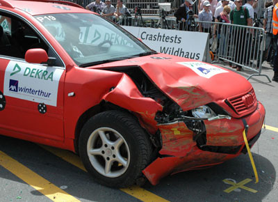 von 11: Der erste Crash simulierte einen Aufprall auf einen Anpralldämpfer, die in der Schweiz häufig eingesetzt werden, in Deutschland jedoch nur selten zu sehen sind