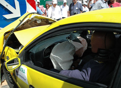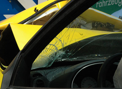 von 11: Das Fahrzeug wird durch die Kollision heftig abgebremst. Mit dem Anpralldämpfer steht neben der Knautschzone des Fahrzeugs ein zusätzliches Deformationselement zur Verfügung, das einen Großteil der Kollisionsenergie aufnimmt