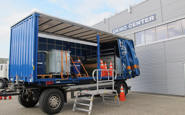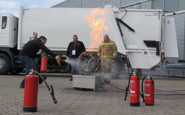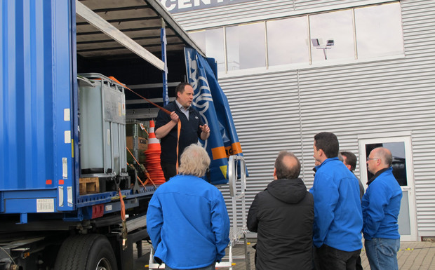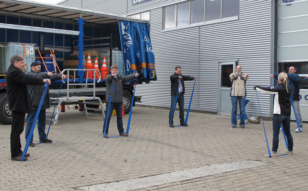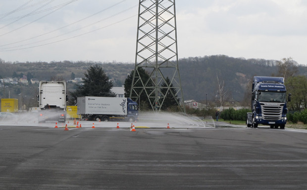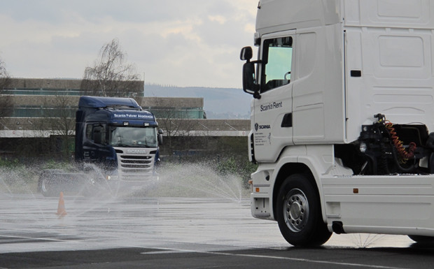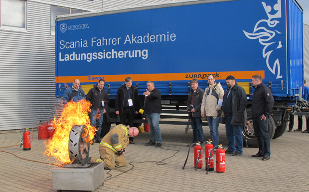 von 9: Holger Maier, Leiter des Scania-Schulungszentrums, und Heinrich A. Haas, 1. Vorsitzender des Fahrlehrer-Verbands Rheinland, begrüßten die teilnehmenden Fahrlehrer