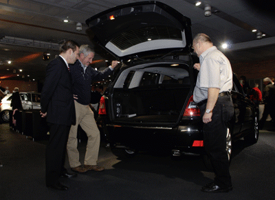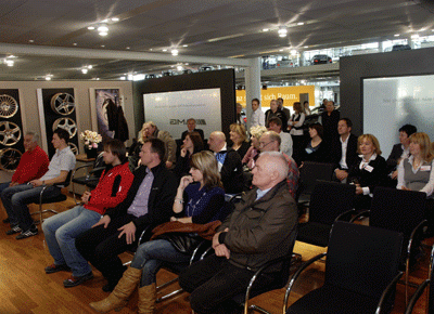 von 9: Fahrschul-Verkäufer Peter Fürsicht (ganz links) präsentierte den ersten in Deutschland ausgestellten GLK mit Heckantrieb und Schaltgetriebe