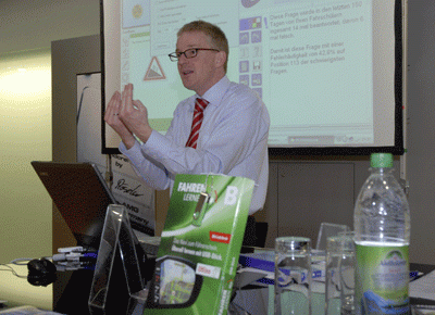 von 9: Peter Lehnert,der für die Lehrmaterial-Abteilung des Verlages Heinrich Vogel verantwortlich ist (Foto), wechselte sich bei den Workshops mit dem freien Mitarbeiter Paul Mooser ab, den viele Fahrlehrer noch als Vogel-Mitarbeiter kennen gelernt haben