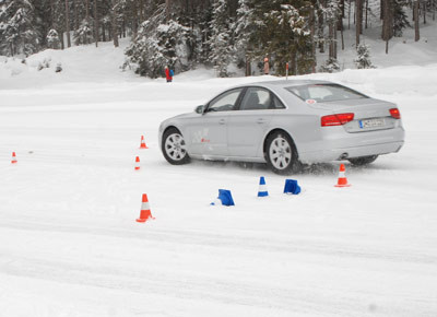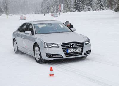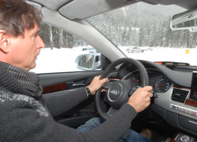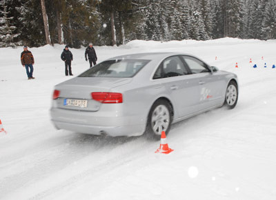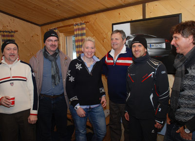 von 12: Veikko Stark (v. l. n. r.), Rudolf Eberl, Sandra Nissen, Tobias Maihöfer und Hans-Peter Viktoria konnten in herrlich verschneiter Umgebung schöne Schwünge im Audi A8 üben