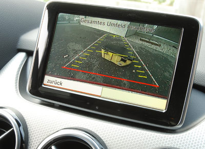 von 12: Die Rückfahrkamera zeigt auf dem Bildschirm des sündhaft teuren Comand-Navigationssystems Hilfslinien an, die das Einparken sehr erleichtern