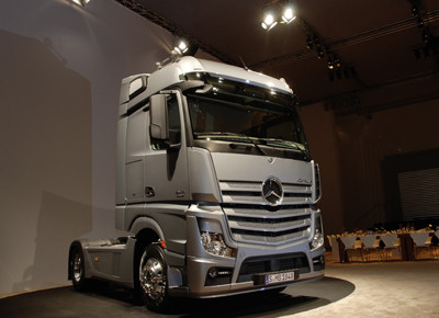 von 5: Eine langbeinige Schweizer Lkw-Fahrerin, die kürzlich einen Misstitel gewonnen hatte, fuhr einen der Actros in die Halle. Stolz auf die hübschen Damen und den neuen Lkw zeigten sich auch (v. l. n. r.) Georg Weiberg, Leiter Entwicklung Nutzfahrzeuge bei Daimler Trucks, Daimler-Vorstandsmitglied Andreas Rentschler, EU-Energiekommissar Günther Oettinger und Hubertus Troska, Leiter Mercedes-Benz Trucks
