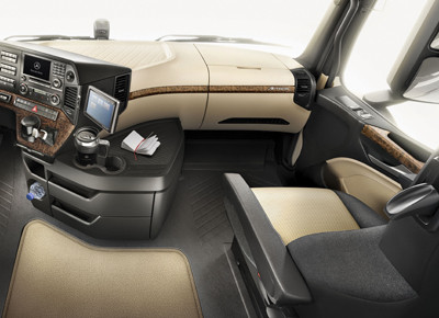 von 5: Die Beifahrerseite der neuen Kabinen ist immer in einem beigen Grundton gehalten, der den Raumeindruck verbessern soll. Wählen kann man darüber hinaus zwischen drei Inneneinrichtungslinien, bei denen die höchste auch mit Leder-bezogenen Armauflagen in den Türen und verchromtem Handbremshebel aufwartet