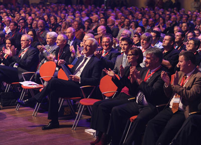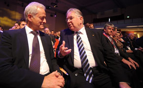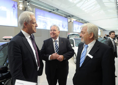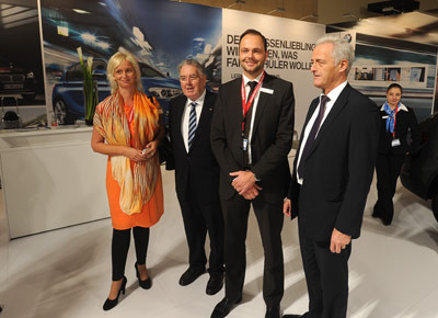 von 7: Am Stand von VW ließ sich der Minister (l.) im Beisein von Gerhard von Bressensdorf die Vorzüge des Golf VII von Fahrschul-Ansprechpartner Bernd Schlunke erklären