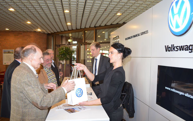 von 13: Friedel Thiele (r.) bedankte sich bei Bernd Baumann vom Hauptsponsor Volkswagen für die jahrelange gute Zusammenarbeit mit einem westfälischen Geschenk