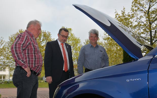 von 11: Nicht nur der Vorsitzende des Thüringer Fahrlehrerverbandes, Gerd-Rüdiger Brandes (M.), war am Audi A3 Sportback g-tron interessiert. Die Fahrlehrer hatten viele Fragen zum Erdgas-betriebenen Fahrzeug