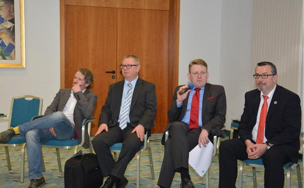 von 11: Stellten sich in der Diskussionsrunde den Fragen der Fahrlehrer: Thüringens Verkehrsminister Christian Carius (Mikrofon), Rechtsanwalt Ulrich Hauk (l., Vortrag: Fahrschulen und social networks) und Dr. Hartmut Kerwien (2. v. l., Vortrag: Ältere Verkehrsteilnehmer – zwischen Normalität und Gefährdung) neben Gerd-Rüdiger Brandes (r.)