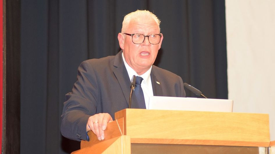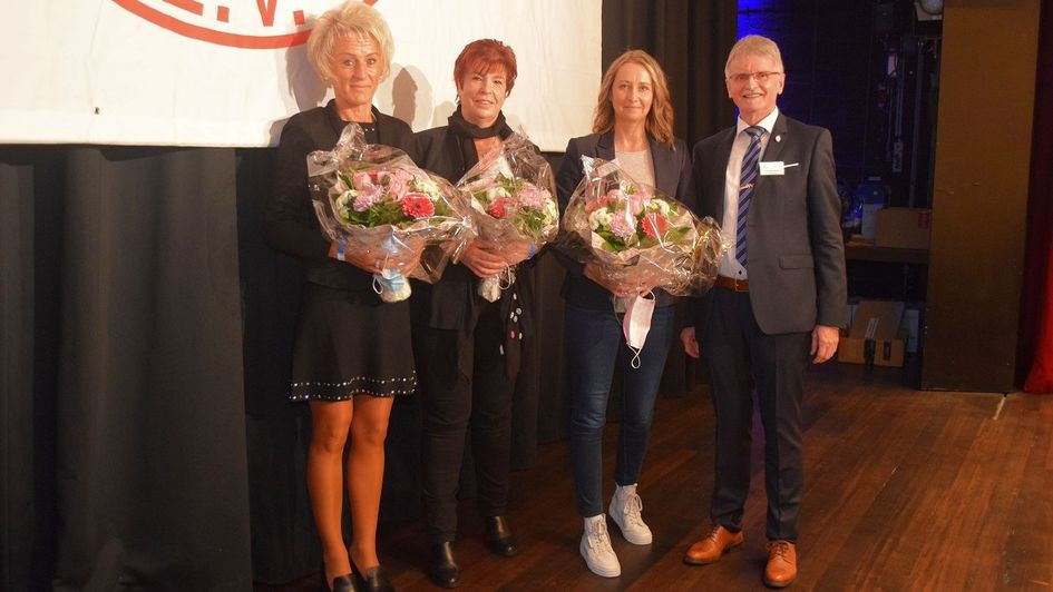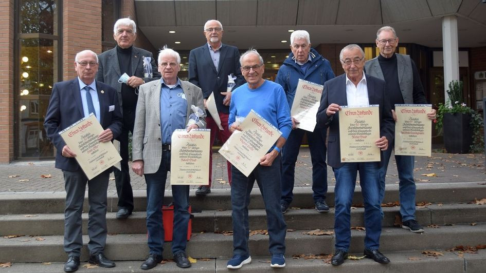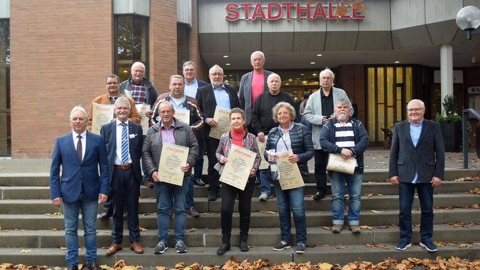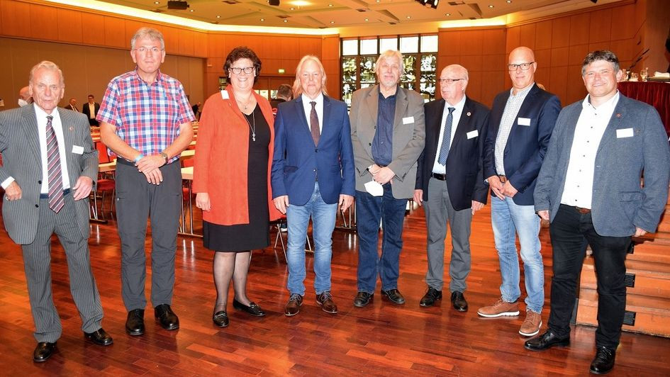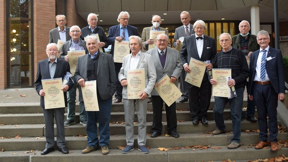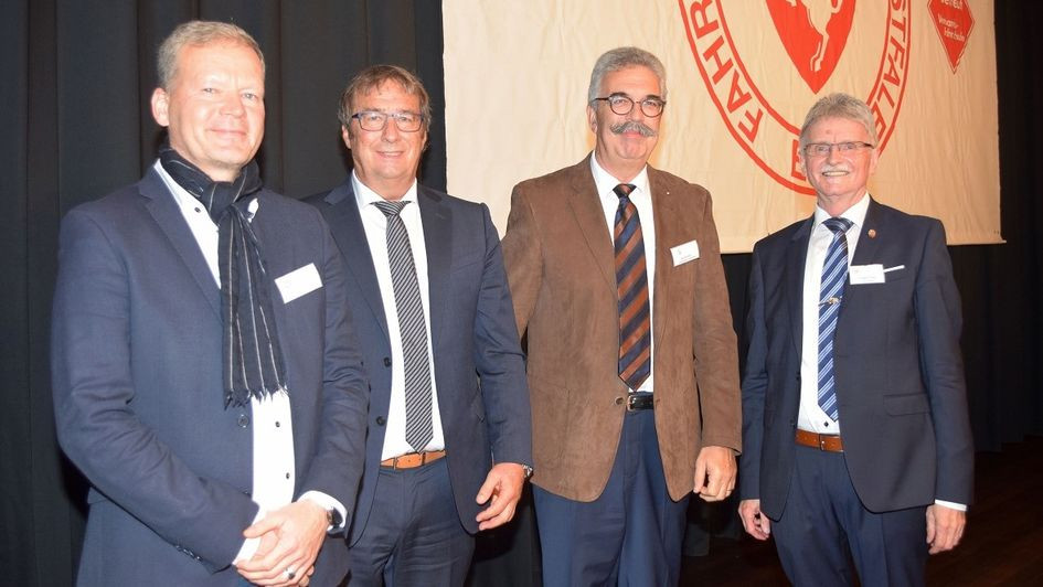 von 12: Verabschiedeten Friedel Thiele (v.l.): Frank Dreier (Vorsitzender des Landesverbands Hessen), Jürgen Kopp (Vorsitzender der Bundesvereinigung), Kurt Bartels (Vorsitzender des Landesverbandes Rheinland) und Friedel Thiele