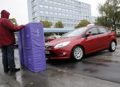 von 8: Die Schaumstoff-Barriere zur Demonstration des Assistenzsystems "Active City Stop" musste wegen des Windes festgehalten werden. Glücklicherweise bremste der Wagen rechtzeitig automatisch ab