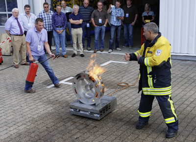 von 16: Frank Hartmann brachte den Gruppen bei, wie man Brände bekämpft, unter anderem mit einem Simulator, der einen brennenden Reifen darstellt