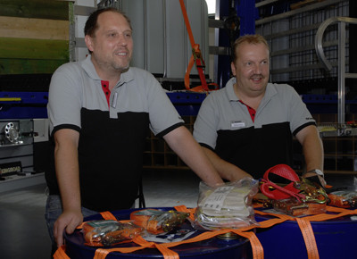 von 16: Wolfgang Hein, Vertriebsleiter des Zurrmittelherstellers Zurrpack (l.) ist Scanias Partner für das Thema Ladungssicherung. Der Fahrlehrer Matthias Arndt gehört auch zu den freien Mitarbeitern der Scania Fahrer Akademie