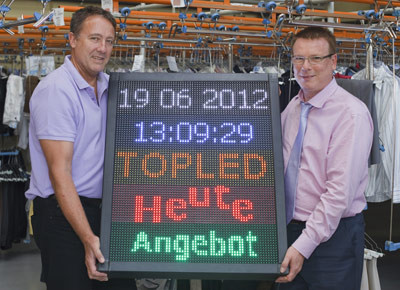von 9: Ein 1 x 1 Meter großes topLED-Infoboard für das Schaufenster spendieren Verkaufsleiter Carlos Puls (l.) und Geschäftsführer Lutz Conradts
