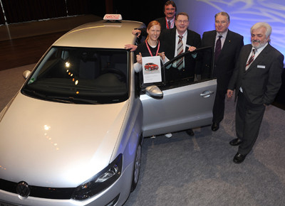 von 18: Thomas Bergmann (an der Fahrertüre) von der Volkswagen Leasing GmbH spendierte einen zwölfmonatigen Leasingvertrag für einen VW Polo, den Simone Grimm aus Gelsenkirchen gewann