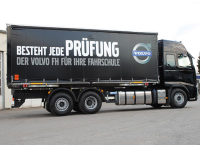 von 12: Der Fahrschul-Lkw hat wegen der Prüfungstauglichkeit ein manuelles 12-Gang-Getriebe, obwohl Volvo im Fernverkehr hauptsächlich das automatisierte Schaltgetriebe I-Shift einbaut